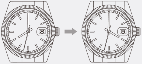 針を時計回りに回して時間を合わせますが、短針(時針)が0時を通過する時に日付が切り替わる