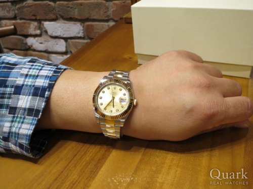 F様 日頃よりご愛顧を賜わり、お礼申し上げます。この度お選び頂きました、デイトジャストII・コンビモデルは、18KYGとダイヤの豪華さに加え、3列のブレスレットがスポーティさも兼ね揃えておりますので、様々なシーンでご愛用頂けるかと思います。36ミリのデイトジャストでは味わえない存在感も魅力ですね。F様のたくましい腕にとてもよくお似合いでした。素敵です!下取もF様が今まで大切にご使用されていたからこそ、ご提示出来た金額です。素晴らしいお時計をお譲り頂き、ありがとうございました!アフターメンテナンス等、しっかりサポートさせて頂きますので、ご不明な点やサイズのお直し等が御座いましたら、お気軽にご連絡下さい。今後ともクォーク神戸店を宜しくお願い致します。 クォーク神戸店 川田