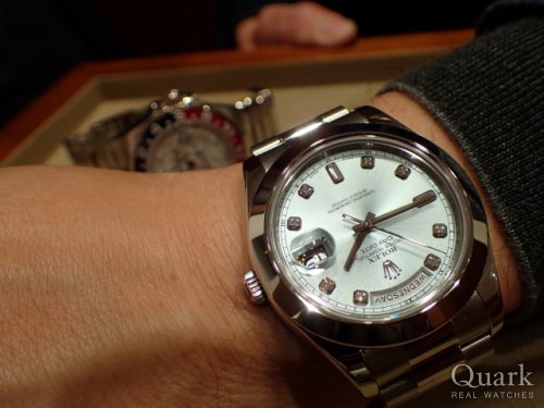 H様、この度はクォーク梅田店をご利用頂きまして誠に有難うございました。日頃よりご愛顧下さり心より感謝を申し上げます。今回ご購入頂きましたのは、オールプラチナ仕様のデイデイトIIです。今の現行モデルより1ミリ大きい41ミリのサイズ感が海外でも非常に人気があり、最近益々希少になっております。プラチナ特有の重厚感や品位だけでなく、採用されたスムースベゼルがすっきり感も演出し、ご使用の幅を広げている造りは見事ですよね。後はなんといってもやはりこのアイスブルーカラーが本当に美しく、ステータス性も感じます!36ミリのデイデイトも最高ですが、このサイズ感でしか味わえない迫力や満足感を是非ともお楽しみ頂けましたら幸いです。今回も本当に素敵でとてもお似合いでございました。今後もH様にご満足いただけますよう精一杯努めてまいりますので、末永いお付き合いの程宜しくお願い申し上げます。 クォーク梅田店 井内