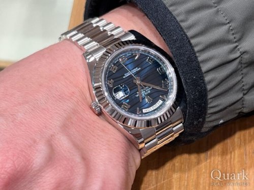 H様、この度はクォーク梅田店をご利用頂きまして誠に有難うございました。日頃より御贔屓下さり心より感謝を申し上げます。この度お選びいただきましたのは、まさに新年に相応しいモデルであります、オールWGのデイデイトII(Ref.218239)でございますね。H様もおっしゃられております通りまさに金の塊ですよね。凄まじいオーラと存在感で他のモデルとは比較になりません。またこの珍しくユニークなブルーウェーブ文字盤がなんとも魅力的でずっと見ていられますね。やはりどもモデルもそうですが、実際に手に取って見てみないと本当の素晴らしさはわかりませんね。H様の雰囲気やお召し物にも本当にマッチされておりとてもお似合いでございました。新たな相棒として末永くご愛用頂けましたら幸いです。今後も最大限サポートさせていただきますので、何なりとご用命くださいませ。本年も何卒宜しくお願い申し上げます。