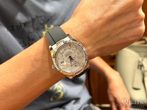 ホワイトゴールドのデイトナに引き続き、今回はスカイドゥエラー!42ミリ径ということでサイズ感が気になられていましたが、思っていたよりしっくりときていましたね。非常によくお似合いでした。スカイドゥエラーは流通量が少なくデザイン・機能性共に抜群のモデルですのでS様のコレクションに加えて頂けて良かったです。