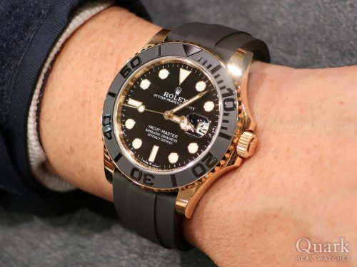 K様、この度はクォーク仙台店をご利用いただきまして誠にありがとうございます。この度お選びいただきました『YACHT-MASTER Ref.226658』は、2022年に42mm径YGケースとスポーティなオイスターフレックスブレスレットの組み合わせで発表された1本で、ヨットマスターシリーズのYG素材を採用したモデルとしては約6年ぶりの登場となります。黒×金のお色味がマッチするのは勿論の事、ダイヤルがマットブラック、セラミック製ベゼルはマット地のサンドブラスト仕上げの中に、立体的に浮き出た数字と目盛り部分はポリッシュ仕上げといった、各所の黒で絶妙に引き締まった印象が非常に魅力的です。金無垢時計をご希望いただいておりましたが、Ref.226658はヨットマスター特有の丸みのあるフォルムで確かな存在感を有しつつ、過度な主張にならないバランス感覚に優れるとも評されており、程よいスポーティさが大人の色気を感じさせるモデルですので、末永くご愛用いただけますと幸いです。なお、今後のアフターサービスにおいても、更にご満足いただけますよう一層精進して参る所存でございますので、ご使用に際して気になる事などございましたら、お気軽にお申し付けくださいませ。末永いお付き合いのほど、よろしくお願い申し上げます。