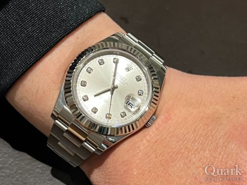 I様 いつもはクォークをご利用頂きまして、誠にありがとうございます。お選びいただきましたデイトジャストIIのシルバー10Pダイヤルは現行にはないパターンであり、上品な印象ながら華やかさも兼ねる1本となっております。コンディションも良好な個体であり、所有されているデイトジャストとも差別化できるため、活躍の機会も多いかと存じます。I様にも大変よくお似合いでした。末永くご愛用頂ければ嬉しく存じます。お近くに来る機会がございましたら、お気軽にお立ち寄りくださいませ。