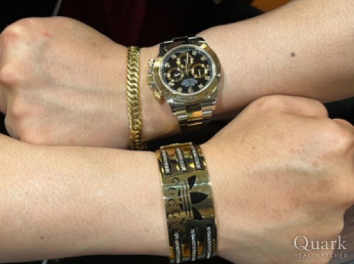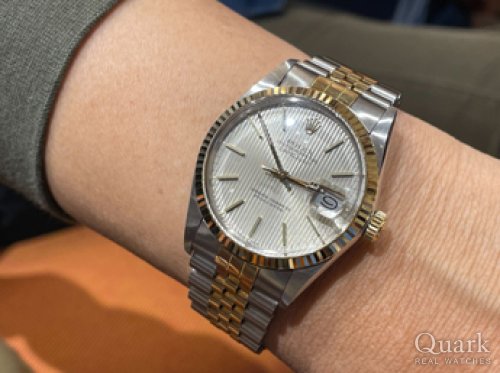 サークル刻印入りの付属付きのランダム品番を探していました。購入したらグリーンダイヤルに文字盤交換をするつもりなので、何色でもよかったのですが、今回購入したシャンパンローマダイヤルも18Kイエローゴールドのケースとマッチしておりとても捨てがたいダイヤルです。