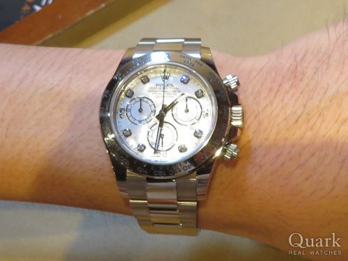 O様 この度は数ある時計店からクォーク上野本店をご利用いただき誠にありがとうございます。O様、10年ぶりのDAYTONAご購入おめでとうございます!今回ご紹介させていただきました116509NGは珍しいホワイトシェルの文字盤に8Pダイヤモンドといった高級感抜群のお時計となります。入荷数も少なく人気のモデルとなりますので是非、末永くご使用していただければと思います。ブレスレットの洗浄及び調整も無料で行っておりますので、お近くにお越しの際は遊びにいらしてくださいませ。お使いいただく上で何かご不明な点等ございましたら、また林までご相談ください。今後とも末永いお付き合いの程よろしくお願いいたします。