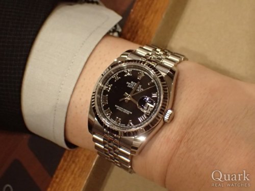 バースイヤーのオイスターデイトを所有しており、使い分けも出来るモデルとして、5連ブレス・黒文字盤の現行デイトジャストを選びました!ロレックスの中でもベーシックなサイズ感やバーインデックスの文字盤も見やすく、落ち着いた雰囲気が気に入っています!