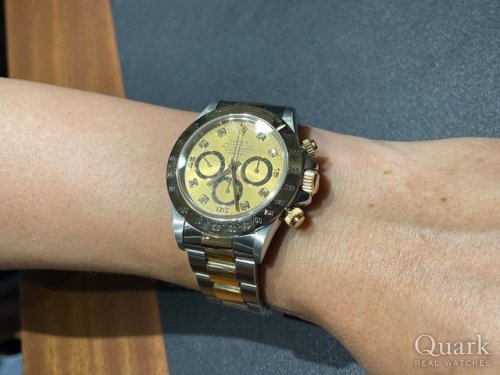 S様 この度は数ある時計店からクォーク名古屋駅店をご利用いただき誠にありがとうございます。今月2本目のご購入ありがとうございます。ご購入いただきました『Ref.16523G』シャンパンダイヤルは1988年~2000年まで製造されていたデイトナでございます。搭載されているムーブメントCal.4030は、傑作自動巻きクロノ・ムーブと謳われるゼニス社「エル・プリメロ」をベースにさらなる耐久性を求め、ロレックス独自の改良が施されているモデルでございます。ゴージャスさが引き立つダイヤルでS様にピッタリのお時計になると存じます。また当店でブレス洗浄、タイムチェックも無料で行っておりますので、お近くにお越しの際は遊びにいらしてくださいませ。お使いいただく上で何かご不明な点等ございましたら、また久保までご相談ください。今後とも末永いお付き合いの程よろしくお願いいたします。