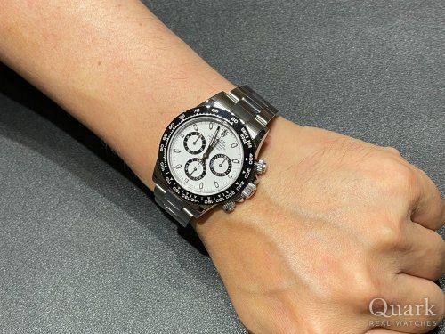 T様 いつもクォーク上野本店をご利用いただき誠にありがとうございます。欲しかった時計だったとの事でコンディションの良い個体をご紹介出来た事、嬉しく思います。2023年3月に惜しまれながらも生産終了となったこちらのモデルは、1965年に誕生したプラスチックベゼルを彷彿とさせるセラミックベゼルに耐蝕性と耐傷性に優れた、紫外線による影響を受けにくいPVD(物理蒸着)加工を採用。プラチナの薄い層でコーティングされたタキメーター目盛りが高い視認性を実現しております。これからの季節にもピッタリなお時計かと存じますので沢山ご使用いただけますと幸いです。ブレスレットの洗浄及び調整も無料で行っておりますので、お近くにお越しの際は遊びにいらしてくださいませ。お使いいただく上で何かご不明な点等ございましたら、また林までご相談ください。今後とも末永いお付き合いの程よろしくお願いいたします。