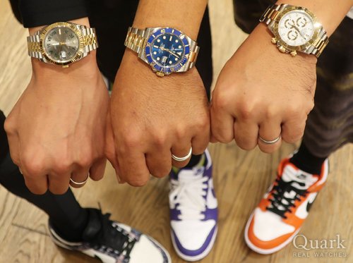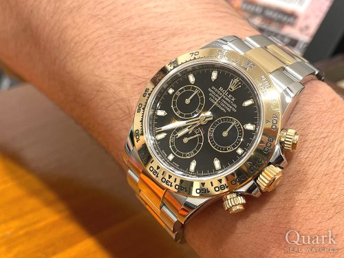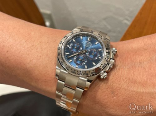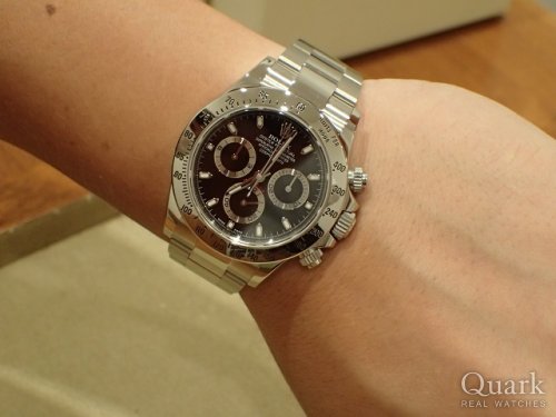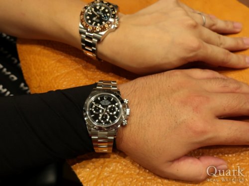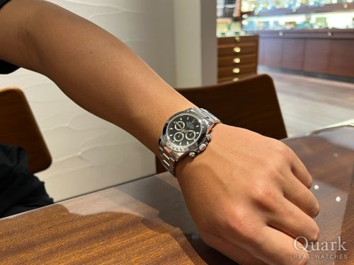 誕生日2日前に目標だったROLEXのDAYTONAを遂に購入しました。購入までの数日間はYACHT-MASTER IIにしようかDAYTONAの白文字盤にしようか悩みましたが、周りの意見や彼女の一言(一番似合っている)が決め手でDAYTONA Ref.116503 ブラックダイヤルにしました。これを励みに仕事を頑張り、次回はYACHT-MASTER IIの金無垢、Ref.116688を購入したいと思います。クォークさんでは色々なモデルを着けさせて頂き、どれもカッコ良くて迷いましたが、実際に着ける事ができて最後は納得して購入する事が出来ました。