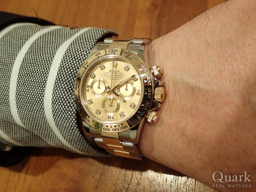 憧れていたシャンパン文字盤をついに購入することが出来ました。ゴールドとシャンパン文字盤とダイヤの高級感が素晴らしいです!本当に感無量です!