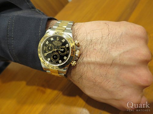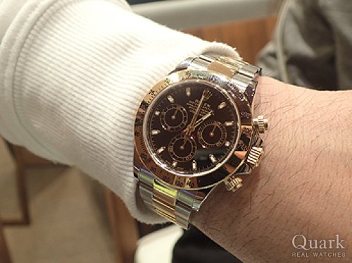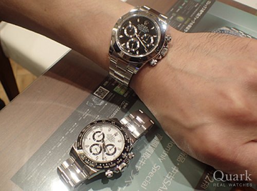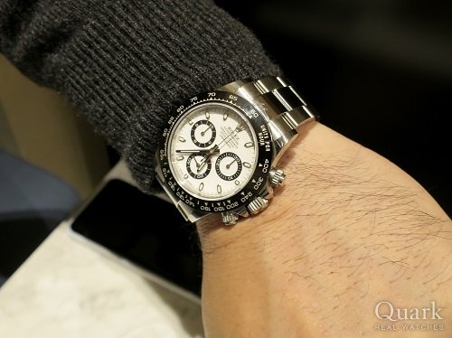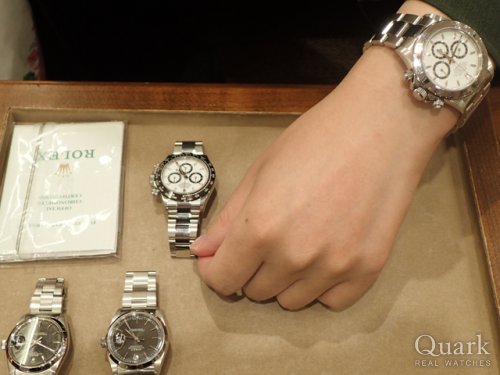 3年前にクォークさんでDAYTONAの白文字盤を、今回は旧型のDAYTONA(Ref.116520)黒文字盤を購入しました。今後値段が高騰して購入し難くなる前に新品の旧型DAYTONAを欲しかったのと、以前に購入した際の通販での対応が良かったので、今度は直接お店に伺いました。未だに旧型DAYTONA(Ref.116520)の新品を取り扱っているお店様が少ないのもクォークさんを選んだ理由です。
