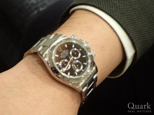 U様、この度は当店を御利用頂き誠に有難う御座いました。デイトナはロレックスの中でも唯一クロノグラフを搭載した特別な存在で、その人気は他モデルと比べても別格で御座います。また初めての高級腕時計の購入ということもありU様のご購入に携われて嬉しく思います。ご使用において気になる点が御座いましたらお気軽にお申し付け下さい。メンテナンスや無料のブレスレットクリーニングなども御座いますので、今後とも宜しくお願い致します。クォーク名古屋店 長瀬