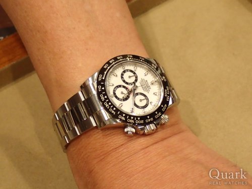 当初はホワイト文字盤のデイトナを探していました。店頭に行ったら、ホワイトとブラック両方ありました。実際に着用するとブラック文字盤がカッコ良くて購入しました。