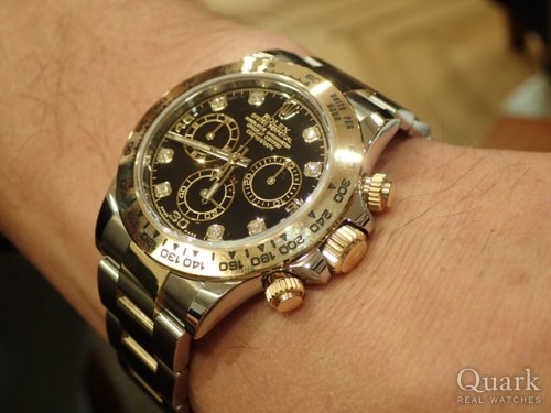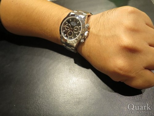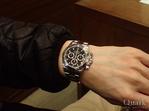 M様、この度はクォークなんば店をご利用頂き誠に有難うございます。ご選択頂きましたデイトナは、ロレックススポーツを代表するモデルです。スポーツモデルながら高級感のあるデザインは幅広い層に支持されており、知名度も高いお品です。また、ブラックダイヤルの引き締まった雰囲気がホワイトよりもドレッシーな印象でスーツにもよく合います。是非、デイトナライフをご堪能下さいませ。お時計をご使用頂き何か不明な点等ございましたらお気軽にご相談下さい。また、ブレスレットの洗浄・調整も無料で承っておりますので近くにお越しの際は是非お申し付け下さいませ。今後ともクォークなんば店を宜しくお願い致します。