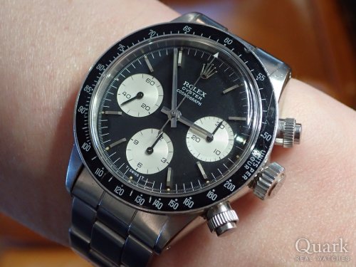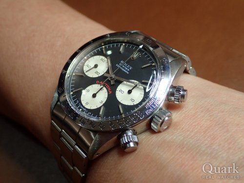 今年の自身への誕生祝いは何に?来月、50歳・節目の年を迎えるにあたり、そんな事を考えていた際に出逢えたコチラ。【手巻きデイトナ】は過去《6263=黒文字盤とポール・ニューマン》の2本と《6265=シルバー文字盤》を愛用。今回は、違ったイメージの個体をチョイス。あまり見掛けない《黒BIG×σダイヤル》のダブル表記が特徴的。更にプッシャー&ベゼル・巻きブレスに至るまで《パーツ類全てがオリジナル》と、正に自身の好みにピッタリ。一度は全てを手放した手巻きも、再度【相棒】として復活です。佐藤様・並びにQuarkスタッフの皆様、本当にいつも素敵なモデルのご紹介感謝致します。これからも、宜しくお願い申し上げます。