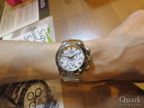 エバーローズの116505と迷いましたがWGの落ち着きのある輝きとピンクのシェルダイヤルなどに惹かれ購入を決めました。現在所有の116500LNのSSとはまた違った輝きがとても気に入りました。一生人生のパートナーとして大切にしていきたいです。