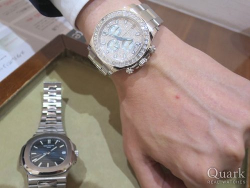 M様 いつもクォーク上野本店をご利用頂き誠にありがとうございます。今回はDAYTONA Ref.116576TBRのご購入のお手伝いが出来た事、大変嬉しく思います。デイトナ生誕50周年を記念して登場したプラチナモデルでダイヤルはインダイヤル以外は全てダイヤモンドが施され、ベゼルには大粒のバケットダイヤ(計4.5カラット)が36個セッティングされた豪華仕様のデイトナとなります。116576TBRは現在では生産が終了しており、希少性のあるお時計です。ご使用頂きしっかりとサポートさせて頂きますので今後、お時計の事で何かございましたらお気軽にご相談下さいませ。宜しくお願いいたします。