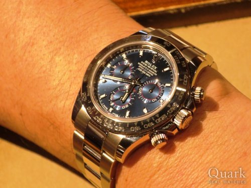S様 いつもクォーク上野本店をご利用頂き誠にありがとうございます。今回はDAYTONA Ref.116509ブルーダイヤルのご購入のお手伝いが出来た事、大変嬉しく思います。今回ご購入頂いたデイトナはブレスレット・ケースなど全てに18Kホワイトゴールドを使用し高級感を醸し出すデイトナとなります。これからの季節にピッタリな深いブルーのダイヤルが、18KWGモデル専用のダイヤルとなり落ち着きのある風格をお楽しみ頂けます。ご使用頂きしっかりとサポートさせて頂きますので今後、お時計の事で何かございましたらお気軽にご相談下さいませ。宜しくお願いいたします。