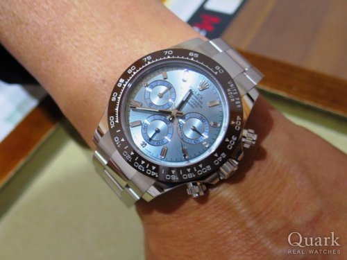 J様 この度はM様のご紹介によりクォーク上野本店をご利用頂き誠にありがとうございます。今回はDAYTONA Ref.116506Aアイスブルーダイヤルのご購入のお手伝いが出来た事、大変嬉しく思います。今回ご購入頂いたお時計はケースなど全てにプラチナを使用し、プラチナモデル専用のチェスナットブラウン色のセラミックベゼルを採用したデイトナ生誕50周年記念モデルとなります。ここ数年、生産数が非常に少なく、正規店での入荷も殆どなく、ステンレスモデルと同様にプレミアム価格となっております。金無垢モデルならではの腕に装着した時のズッシリとした重量感をお楽しみ下さいまで。ご使用頂きしっかりとサポートさせて頂きますので今後、お時計の事で何かございましたらお気軽にご相談下さいませ。宜しくお願いいたします。