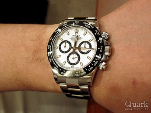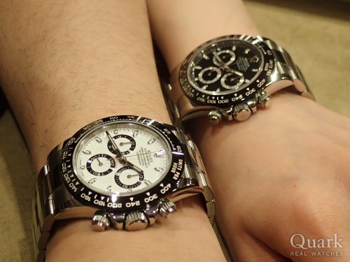 これまでデイトナは多数所有してきました。黒文字盤ばかりでしたので、前回(この間)初の白文字盤の旧型デイトナを購入させてもらいました。しかし前から気になっていた、セラミックベゼルの新型デイトナの白が、じわじわ気になりはじめ相談したところ良い条件を提示してもらいましたので購入に至りました。ベゼルの艶などバランスがとても良いです。