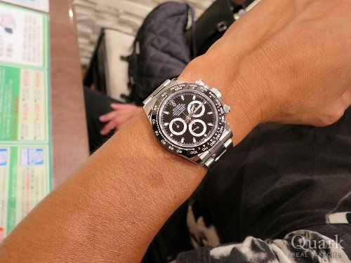O様、いつもクォークをご利用頂き誠に有難うございます。今回ご選択頂いたデイトナ(Ref.116500LN)は2016年の発表以来、人気が衰えず現在でも入手の困難な状況が続いているモデルです。ベゼル部分が以前のステンレスとは違い、ブラックカラーのセラミックベゼルを採用する事で一層スポーティーなデザインへと進化しています。ダイヤルカラーは2色ありますが、O様の仰る通りブラックの方が高級感がありスーツ等にも良く合います。ステータス性も高く、資産として今後の価格も楽しみなモデルですので、末永くご愛用頂ければ幸いです。ご使用される中で、何かご不明な点等ございましたらお気軽にご相談下さい。ブレスレットの調整・洗浄も無料で行なっておりますので、近くにお立ち寄りの際は是非お申し付けください。今後ともクォークなんば店を宜しくお願い致します。 クォークなんば店 山崎