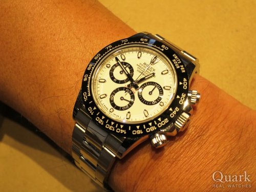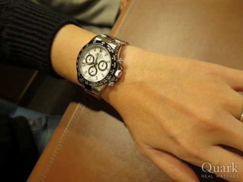 K様 いつもクォーク上野本店をご利用頂き誠にありがとうございます。今回はDAYTONA Ref.116500LNホワイトダイヤルのご購入のお手伝いが出来た事、大変嬉しく思います。2016年にセラミック製のモノブロックセラクロムベゼルを搭載し発表され、前モデルの116520とは一味違った雰囲気が人気の新型デイトナです。K様が感じたように、セラミックベゼルになった事により時計の重量が少し軽くなりました。今回のモデルは白文字盤が人気で、現在でも品数が少なく価格の方も黒より少し高い価格設定になっております。また前日は私が公休を頂いており、K様のご対応が出来ませんでしたが、本日、再度ご来店頂き本当に感謝しております。ご使用頂きしっかりとサポートさせて頂きますので今後、お時計の事で何かございましたらお気軽にご相談下さいませ。宜しくお願いいたします。