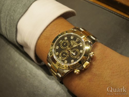 T様 いつもクォーク上野本店をご利用いただき誠にありがとうございます。今回T様にタイミング良くデイトナをご案内でき大変嬉しく思っております。お選びいただきましたRef.116500LNは、生産開始から非常に流通数が少なく入手困難なモデルでございます。また、ブラックのインダイヤルとセラクロムベゼルは相性抜群ですので十分ご堪能下さい。これからご使用いただく上で何かご不明な点等がございましたらお気軽にご連絡くださいませ。今後とも末長いお付き合いの程、どうぞ宜しくお願い致します。クォーク上野本店 岩間