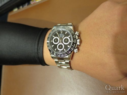 M様、この度はクォーク梅田店をご利用頂きまして誠に有難うございます。お選び頂きましたデイトナ Ref.116500LNはセラミックベゼルを搭載しており、よりスポーティな印象となっております。カジュアルは勿論、フォーマルにも抜群に合うデザインとなっておりますので、末永くご愛用頂ければ幸いでございます。アフターフォローにもしっかり努めて参りますので、これからもクォーク梅田店をよろしくお願い致します。