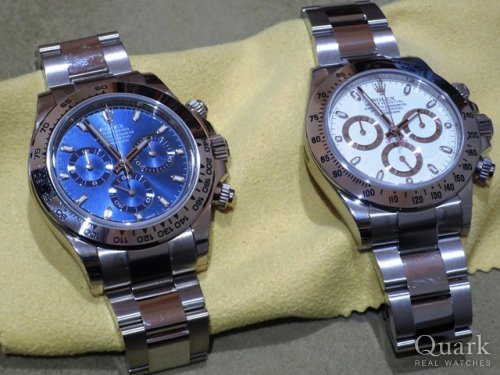 F様 いつも大変お世話になっております。この度もまた弊社のご利用誠にありがとうございます。普段はドレス系のモデルがお好みのF様ですが、今回のデイトナの新色の青はインダイヤルの縁が目立たず、青で全て統一されたデザインが今までの仕様と比べ、ガラッと雰囲気の変わったダイヤルとなります。非常に上品且つ高級感を演出して頂けるデザインとなり、特別な日でご使用頂ければと思います。ホワイトゴールドですので、場所を選ばずお使い頂けるところも魅力の一つですね。また気になるモデルがございましたらお気軽にご連絡下さいませ。今後とも末永いお付き合いの程宜しくお願い申し上げます。 クォーク上野本店 矢島
