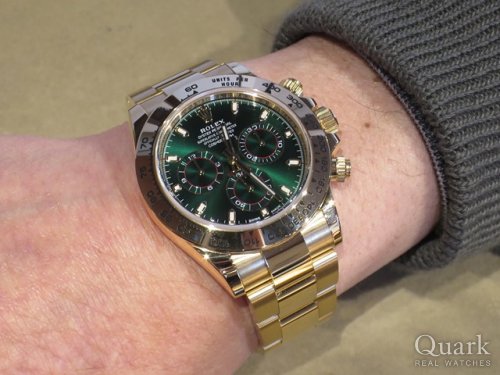 H様 この度は数ある時計店から当店をお選び頂き誠にありがとうございます。まだ数も少なく街中では滅多に目にする事の無いグリーン文字盤の金無垢のデイトナRef.116508。文字盤のグリーンが高級感をさらに引き出し、インパクトは絶大で特に夏場は目立つこと間違いなしですね。色々ロレックスをご経験された中でも、気に入って末永くお使い頂けましたら幸いです。また、お近くにいらした際は是非お立ち寄り下さいませ。今後とも宜しくお願い申し上げます。 クォーク上野本店 矢島