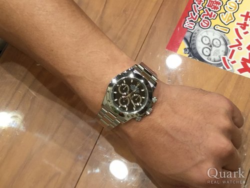 U様 いつもクォーク名古屋店をご利用頂き、誠にありがとう御座いました。サプライズ来店、本当にありがとう御座います。只、お会い出来なかったのが、非常に残念です(笑) U様のお気持ちが私自身本当に嬉しく思っております。当初のご予定よりも早く驚きましたが、お選び頂いたデイトナは、生産終了が発表されましたので、今回ご購入頂いたタイミングはとても良かったと感じております。ステータス性・資産性を兼ね備えたロレックスの顔ともいえるデイトナは、一生モノとして相応しいモデルです。引き続き、U様のロレックスライフを満喫頂ける様、今後も精一杯サポートさせて頂きます。又、栄にお越しの際は、ご家族皆様でのご来店を楽しみにしております。今後とも末永いお付き合いお程、宜しくお願い致します。