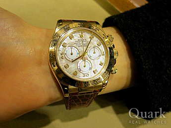 H様 この度はクォーク仙台店をご利用くださいまして誠にありがとうございます。Ref.16523はデイトナファンの方からも根強い人気で支持されております。イエローゴールドのラグジュアリー感がありながらも落ち着いたホワイトの文字盤がH様に大変お似合いでございました。お子様からの『かっこいい!!』というお言葉が何よりの証拠ではないでしょうか。自分へのご褒美、素敵ですね!!また、何度も足を運んで頂きまして誠にありがとうございます。記念すべき1本をお手伝いできて私自身も大変嬉しいです。腕時計は試着してみないとわからない部分もございます。今後、何か気になるモデルなどありましたら出来る限り対応させて頂きますのでお気軽にお申し付けくださいませ。また、ブレス洗浄、サイズ調整を無料で承っておりますので是非お店に遊びにいらしてください。今後とも末長いお付き合いの程宜しくお願い申し上げます。
