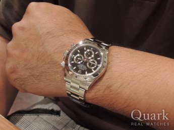知人がホワイトダイヤルをしていてデイトナが格好良いと思いました。自分はブラックを購入してみました。