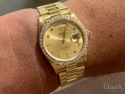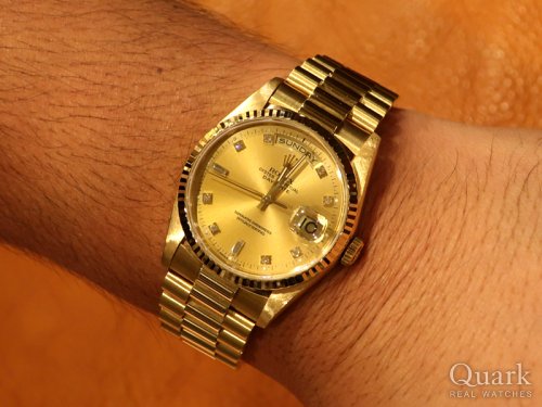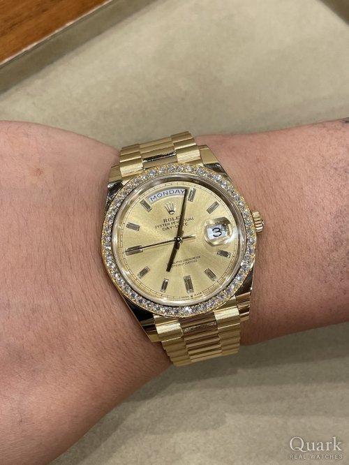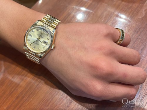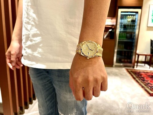 O様、この度はクォーク仙台店をご利用いただきまして誠にありがとうございます。O様がお選びになられた『Ref.18238A』は、ロレックスが大まかにスポーツ、スタンダードでジャンル分けされる中で、スタンダードのハイエンドモデルでございます。ロレックス全体で見ても、ラインナップがゴールド素材およびプラチナ素材のみで展開されているのはデイデイトのみで、当モデルがラグジュアリーラインとして欠かせない不動の存在であることが分かります。K様がお選びになられた個体は、前述の通り18Kイエローゴールドを使用した高貴な素材感と重厚感、そしてイエローゴールドと相性が良く統一感があるシャンパンダイヤル、美しくカッティングされたダイヤが総じてラグジュアリーな雰囲気を演出しており、ゴールド好きにはたまらない1本ではないでしょうか。元々、生産されている数が少ない点もありますが、弊社においても在庫数が限られる中で、今回タイミング良くK様の条件に合う個体をご紹介できましたことを嬉しく思います。これから末永くご愛用いただけましたら幸いでございます。また、お褒めのお言葉をいただきまして重ねて心より厚く御礼申し上げます。今後もO様のご期待に応えられるよう、日々精進して参ります。尚、ご使用に際して気になる点がございましたら、しっかりサポートさせていただきますので、お気軽にお申し付けくださいませ。どうぞ、今後とも変わらぬご愛顧を賜ります様、よろしくお願い申し上げます。 クォーク仙台店 沼澤