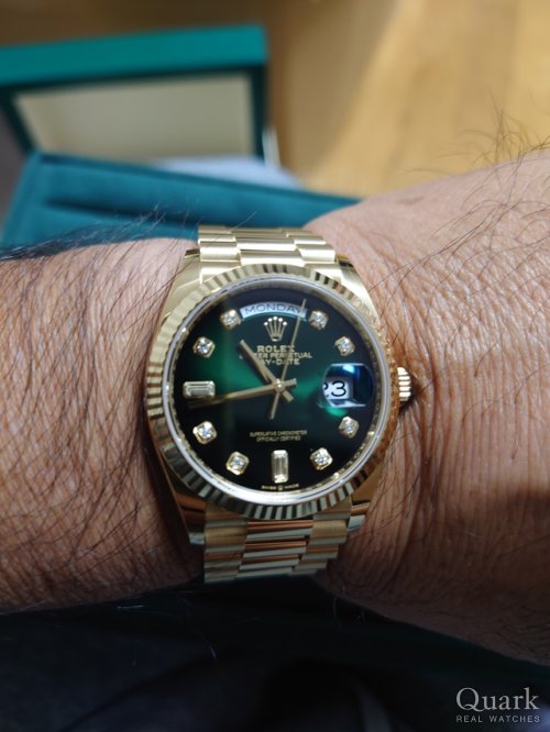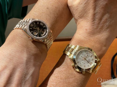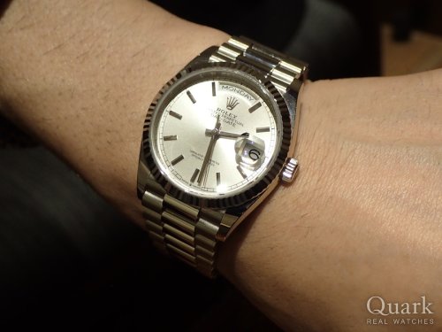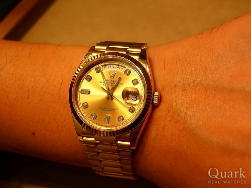 I様 この度もクォーク銀座888店をご利用いただき誠にありがとうございます。これまでご購入頂いたモデルを加味して、ご提案いたしました。お気に召して頂き大変光栄でございます。以前ご購入頂いたRef.16523のホワイトダイヤルもとてもお似合いでございましたので、きっとイエローゴールドのDAY-DATEもお似合いになるはず!と、心の中で思っておりました。36mmケースにもかかわらず金無垢特有の重さがまた満足感に比例して頂けると思います。20代でDAY-DATE、とても羨ましい限りでございます!本当におめでとうございます!DAY-DATEは私も憧れのモデルでございます。DAY-DATEオーナーとしてはI様が先輩となりましたので、ぜひまた着用感などご教示ください!こちらこそ今後ともよろしくお願いいたします。またお会いできる日を楽しみにしております。 銀座888店 友部