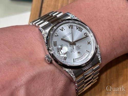 H様、この度もクォーク梅田店をご利用頂きまして誠に有難うございました。日頃より御愛顧下さり心より感謝を申し上げます。この度お選びいただきましたのは、デイデイトのプラチナモデル Ref.118296(アイスブルー)でございます。ローマインデックス文字盤にラグダイヤといった珍しい組み合わせで、高級感とカジュアルさが見事にマッチした素晴らしいお品です。長年ご愛用頂いているように感じる程、H様との相性を感じましたし着用されるたびに魅力が溢れておりました。今後共末永くご愛用頂けましたら幸いでございます。今後もお喜び頂けますよう最大限ご尽力致しますので、何なりとご用命くださいませ。何卒、宜しくお願い申し上げます。                                     クォーク梅田店 井内