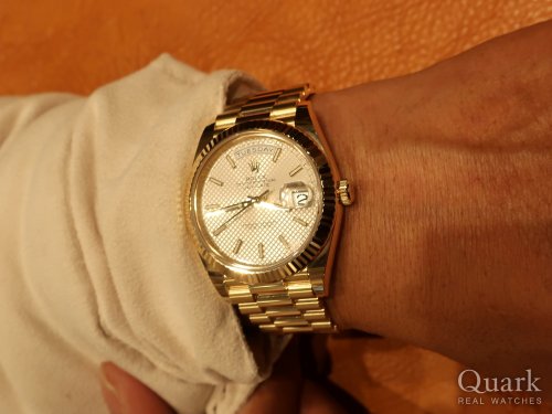 K様 この度はクォーク仙台店をご利用くださいまして誠にありがとうございます。ロレックスのスタンダードモデル最高峰「デイデイト」ご購入くださいまして重ねてお礼申し上げます。「Ref.228238」はケースサイズ40ミリですので、より迫力が感じられるデザインです。また、プレジテントブレスや曜日表記もデイデイトならではのポイントです。格子状のデザインで「ダイアゴナル」と呼ばれる特徴的なダイヤルは、イエローゴールドとの相性が抜群でございます。お仕事もオフの日も、ロレックスをお楽しみくださいませ。そしてご結婚20周年おめでとうございます! 記念の1本をお手伝いできて大変光栄でございます。今後も末永いお付き合いよろしくお願い申し上げます。