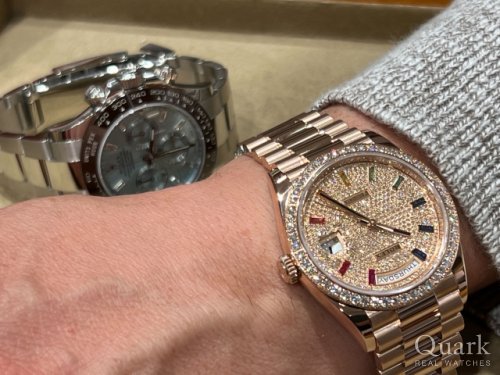 M様 この度はクォーク仙台店をご利用くださいまして誠にありがとうございます。ダイヤル全面にダイヤモンドを配したラグジュアリーモデル「Ref.228238A デイデイト40」は、腕に着けるのはもちろん、眺めるだけでも楽しいデザインでございます。デイデイトのダイヤルデザインは様々ございますが、ここまで多くのダイヤモンドを使ったデザインは限られております。その希少性も併せてお楽しみください。残念ながらサッカーは敗退してしましましたが、日本がとても盛り上がった2022年にご購入されたモデルとして、記憶に残るのではないでしょうか。今後もしっかり対応いたしますので、これからもどうぞよろしくお願いいたします。
