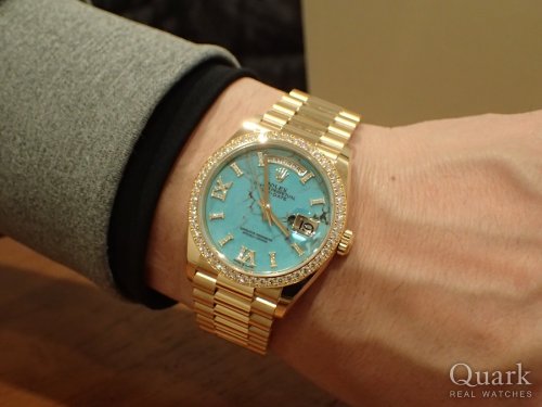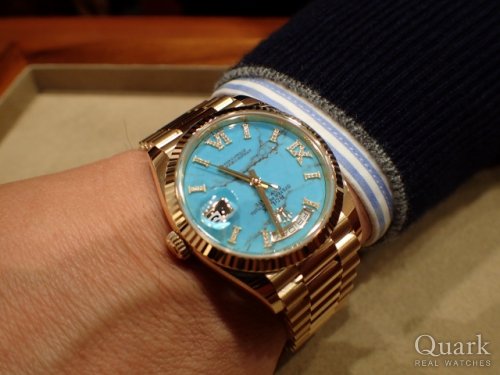 今まで何本もステンレスモデルのROLEXやそれ以外のブランドモデルを持ってきたが、刺激が足りない。やはり自分は金無垢の時計が好きなんだと実感しました。現行モデルのDAY-DATEで、ターコイズブルーダイヤルがなんともカッコいい!OYSTER PERPETUALのターコイズブルーとは違い、天然石を使用しているので、ダイヤル模様は選べないけど、今回購入したターコイズブルーダイヤルは納得の柄(模様)でした。