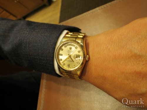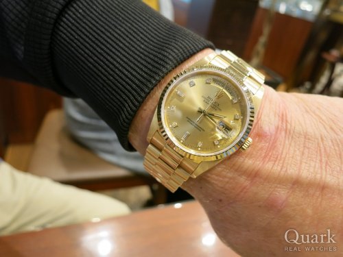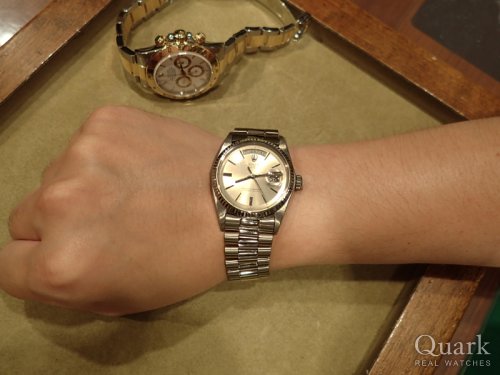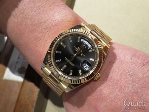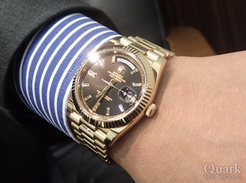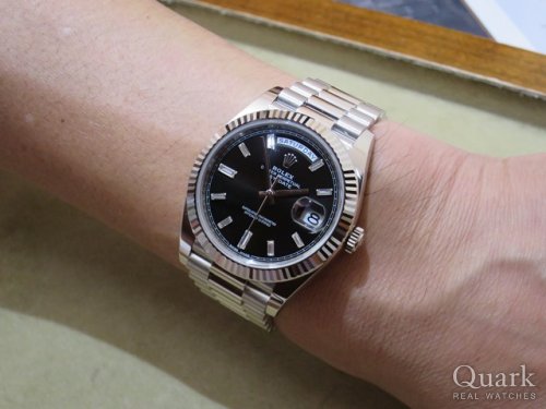 H様 この度は数ある時計店の中からクォーク上野本店をご利用頂き誠にありがとうございます。今回はDAY-DATE40 Ref.228238Aブラックダイヤルのご購入のお手伝いが出来た事、大変嬉しく思います。本日ご購入頂きましたデイデイト40は、これまでのデイデイトよりケース径が4mmサイズアップされたことで、高級感が増し視認性も大幅向上しております。またダイヤルのお色がブラックの為、大粒のダイヤモンドがさらに目立ち、高級感を演出しております。ご使用頂きしっかりとサポートさせて頂きますので今後、お時計の事で何かございましたらお気軽にご相談下さいませ。宜しくお願いいたします。