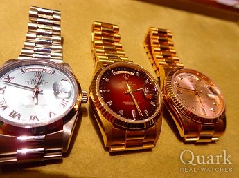 昨年の『アイスブルー』、先月の『ピンク10P』に引き続き、今回は生産終了され希少である『チェリー・グラデーション』を購入しました。 これで『Pt,・PG・YG』3色それぞれ、好みのダイヤルカラーのデイデイトを揃える事が出来ました。 いつも、こちらの様々な要望を聞き入れて頂き、クォーク・並びに佐藤様には、本当に感謝しております。 これからもステキなコレクションのご紹介、宜しくお願い申し上げます。