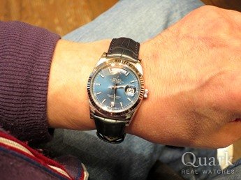 ホームページでロレックスを見ていたら、デイデイトの青を見つけたので、欲しくなりました。 ブラウンの文字盤もいいなとも思いましたが、色合いが気に入ったのでブルーにしました。 天気や光の加減で、薄くなったり濃くなったりと見え方がかわってくるので、良いなと思いました。