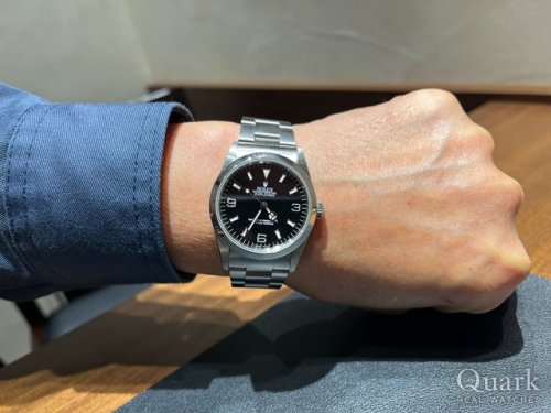 1年前に久保さんからヴィンテージのエアキングRef.5500 シルバーダイヤルを購入したときに 次回は黒文字盤のROLEXを買うと宣言しており、 その間、何点か紹介してもらっておりました。 そこで1週間前に店頭で話させていただいたときにEXPLORERⅠのシングルバックルを紹介していただきました。文字盤が少し個性的なエイジングをしており唯一無二の時計だと感じ購入を決めました。