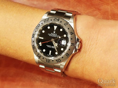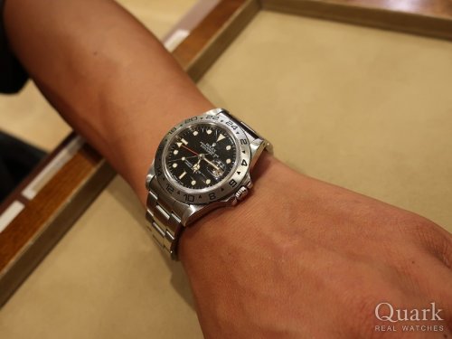 K様、この度はクォーク仙台店をご利用いただきまして誠にありがとうございます。K様がお選びになられた『Ref.16570』は、歴代のエクスプローラーIIシリーズの中で最長のロングセラーモデルです。昼夜の判別が難しい洞窟探検家向けに設定されたコンセプトに則り、GMT針(24時間針)を施したことで、メカニカルなデザイン性とスポーツモデルらしいストイックな機能を有しております。約20年間生産された同モデルの中で今回K様がお選びになられた個体は、セミヴィンテージ世代として注目度が高い、『トリチウム夜光』『シングルバックル』が備わる個体です。そして前述のディティールと併せまして、全体のポリッシュ感が少ない、とてもパリっとした状態は近年のトレンドにも当てはまる条件が良い個体をお選びいただきました。