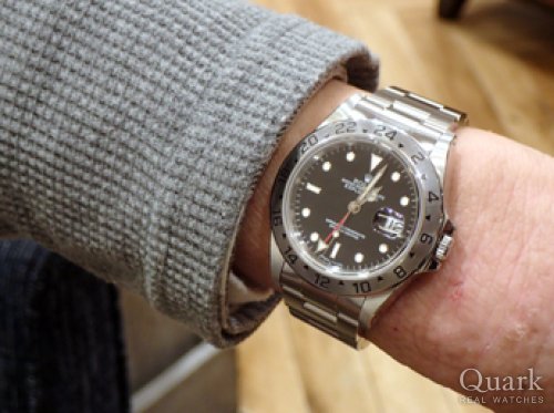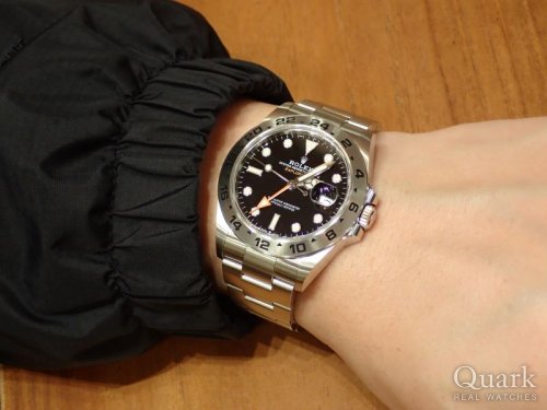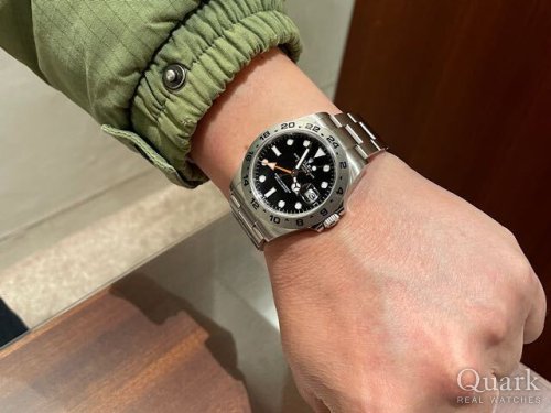 T様 この度はクォーク神戸店をご利用頂きまして、誠にありがとうございます。今回ご購入頂きましたエクスプローラーIIは42mmケースサイズに見やすいダイヤル・針のバランスが絶妙となっており、高い視認性を持つ実用時計となっております。ブラックダイヤルの綺麗な黒は旧型と異なる部分であり、高級感のある艶感が魅力です。お仕事にプライベートに幅広く、ご愛用頂けましたら幸いでございます。また、近くにお越しの際はブレス洗浄なお気軽にお立ち寄りください。今後ともクォーク神戸店もよろしくお願い申し上げます。