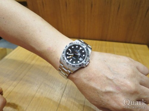 K様、この度はクォーク梅田店をご利用頂きまして誠に有難うございます。今回お選び頂いたエクスプローラーII Ref.216570ブラックはボリュームのある42ミリケースが特徴的ですが、K様の逞しい腕元にとても良くマッチしていましたので自信を持ってオススメさせて頂きました。海外に行かれる機会が多いK様にとって便利な二カ国時間表示の機能も付いておりますので、これから活躍する事間違いなしですね。もしご不明な点等ございましたらお気軽に仰ってくださいませ。今後とも宜しくお願い致します。