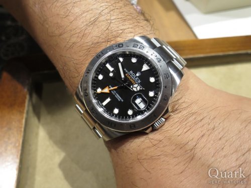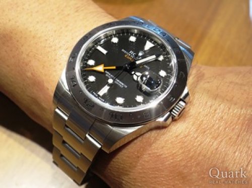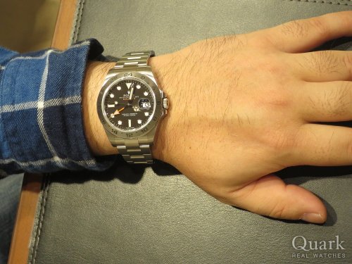O様 この度は、クォーク梅田店をご利用頂き、誠に有難う御座いました。サイズ感で選ばれた今回のエクスプローラーⅡ、42ミリという存在感のある大きさなので、しっかりした腕周りのO様にピッタリの1本ですね!大きさだけでなく、オレンジの24時間針がアクセントになる遊び心のあるデザインも魅力ですので、これから半袖の季節になると、袖口から見えるエクスプローラーII が周囲の目を引きますね!機能面では、2ヶ国の時間表示が可能で、操作が他のモデルとは若干異なります。これからご使用頂き、ご不明な点等が御座いましたら、お気軽にお問い合せください。また、梅田へお越しの際は是非弊店へお立ち寄りくださいませ。またのご来店を心よりお待ち致しております。 クォーク梅田店 川田