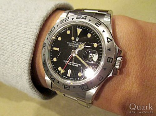 I様 いつもクォークをご利用くださいまして誠にありがとうございます。ご購入くださいました「エクスプローラーII ブラック Ref.16550」は、ごく僅かな期間しか生産されていない希少モデル! さらにレアポイントでもあります「センタースプリット」をおさえた素晴らしい1本でございます。また、お話でも出てきておりました「スパイダーダイヤル」は、経年が出せる深い味わいでございますね。今後お使い頂くなかで、ますます変化が出てくればより愛着が湧いてくることと思います。I様のこだわりは今後も尽きることが無いかと思いますが、しっかり対応させて頂きますので末長いお付き合いの程、何卒宜しくお願い致します。