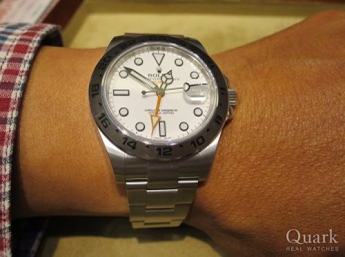 何度も足を運んで、今日購入を決心しました。 色んな時計を見たり試着しましたが、第一印象でエクスプローラーⅡに決めました。黒文字盤は人と被りやすいので白文字盤にしました。長く使えそうなデザインが気に入っています。