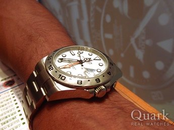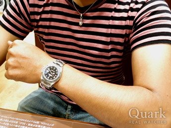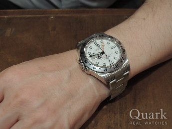 海外によく行くので、GMT 機能があるエクスプローラーII を選びました。 エクスプローラーI Ref.214270 とも見比べてみましたが、24時間針のオレンジ色が気に入りました。 重くて着けた感覚が伝わってきます。 クォークさんは、購入しやすい雰囲気と対応、無理にお勧めしない姿勢がすごく良かった。